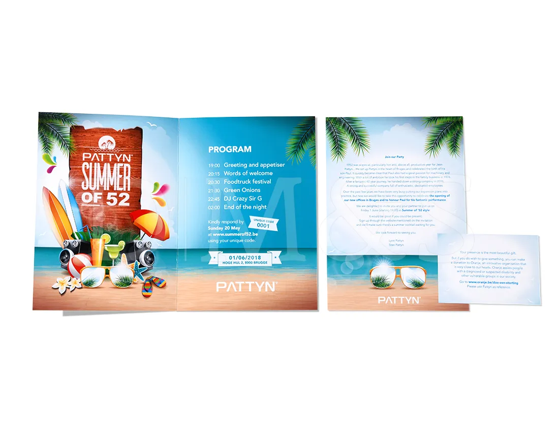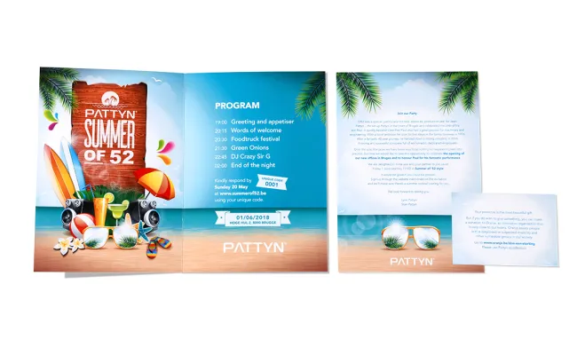 Verpakkingsspecialist Pattyn had meer dan één reden om een feestje te bouwen. Twee jaar geleden opende het een gloednieuw hoofdkantoor in Brugge. Tegelijk ging CEO Paul Pattyn met pensioen en gaf hij de fakkel door aan zijn zoon en dochter. Ons eventteam leidde de feestelijkheden in goede banen en maakte er een spetterende Summer of 52-party van. Het zomers event bracht 300 werknemers en 100 internationale klanten terug in de tijd. Naar de zomer van 1952, het moment waarop opa Jean Pattyn het bedrijf oprichtte. Met palmbomen en muziek van Crazy Sir-G en de coverband Green Onions zat de sfeer er goed in. Al had dat wellicht ook veel te maken met de catering, cocktails en mocktails.
