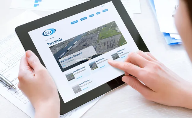 Om zijn activiteiten te promoten bij rederijen en automerken, kan ICO vandaag uitpakken met een sterk visitekaartje: een gloednieuwe website. Deze is zo ontwikkeld dat op de homepage - én op alle andere pagina’s - onmiddellijk duidelijk is voor welke diensten een klant of prospect bij ICO terechtkan. Ook de terminals krijgen een centrale plaats op de site - belangrijk om (potentiële) klanten te overtuigen van de uitstekende ligging en bereikbaarheid.