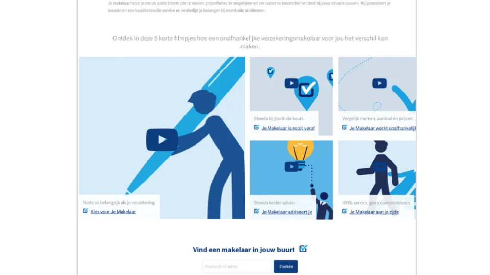 Makelaarinverzekeringen.be ziet er vandaag niet alleen moderner en frisser uit, maar brengt de (potentiële) klant ook dichter bij zijn makelaar. De motor van de nieuwe site is de locator, die alle verzekeringsmakelaars opsomt per regio. De surfer vult zijn postcode of adres in en de locator laat een plattegrond zien met alle kantoren in zijn buurt. Onder het kaartje verschijnt bovendien een adressenlijst, zodat hij niet elke 'pin' open hoeft te klikken. Ook de afstand tussen de online en offline kanalen van Je Makelaar verkleint. De bezoeker vindt namelijk de actuele promotiecampagnes terug op de website, wat de uniformiteit en herkenbaarheid van Je Makelaar stimuleert.