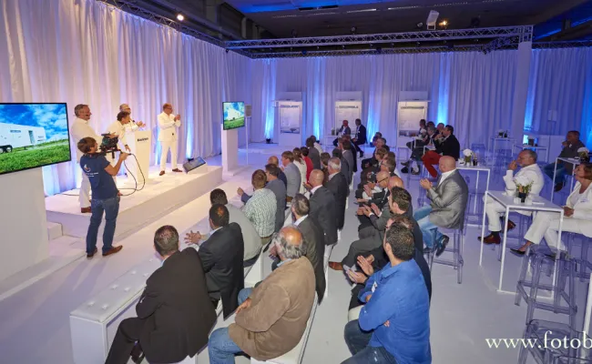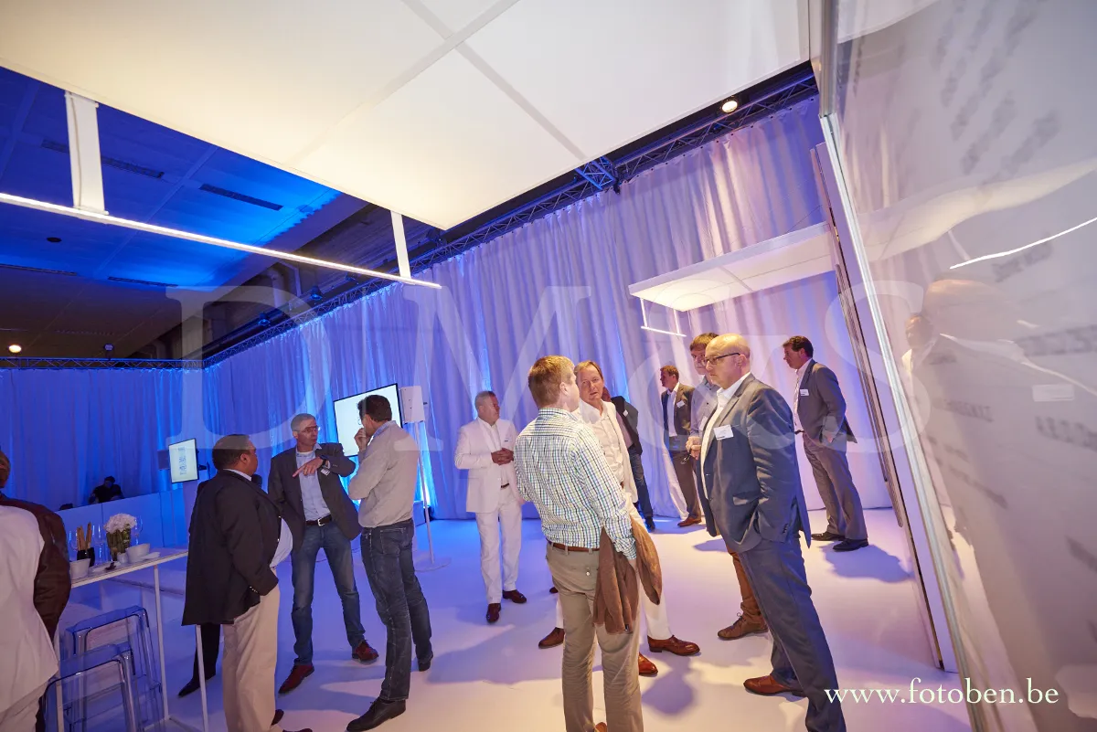 Het witte effect vergrootten we nog door ook de ROCKFON sprekers in wit pak te steken. De gasten werden in de namiddag ontvangen met een openingsreceptie. Na de obligate toespraken - wij leverden de dynamische en verhelderende presentatie -, volgde dan de onthulling van de Blanka-plafondtegel. Dat ging met de nodige show en vonken gepaard!