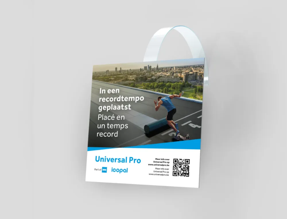 De Universal Pro smeekte om een al even sterk conceptbeeld. Onze visuele specialisten haalden alles uit de kast en kwamen met een eenduidig beeld waarin alle USP’s verwerkt werden. Snel, duurzaam en sterk! Als finishing touch werd de slogan ‘In recordtempo gemaakt’ toegevoegd.