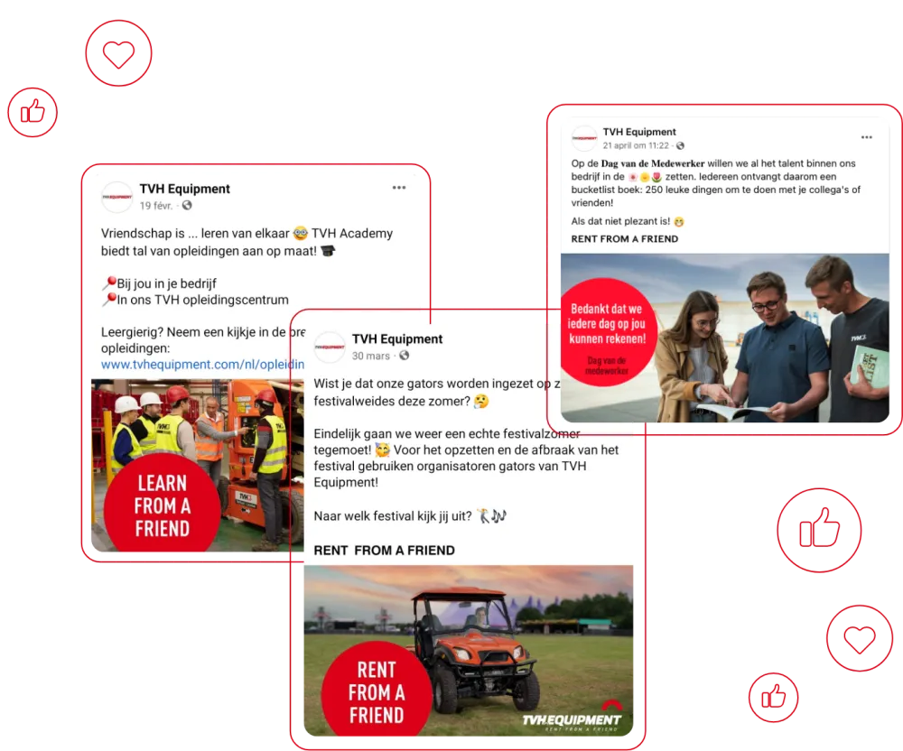 Niet alleen offline, maar ook online gingen we voluit om klanten en medewerkers vertrouwd te maken met het nieuwe merkverhaal van TVH Equipment. Onze online marketeers stelden alles in het werk om sterke posts en advertenties te maken. Die verspreidden we via de social media en Google ads. Verder namen we de website onder de loep. Na een SEO-audit gaven we technische aanbevelingen en tips om de content te optimaliseren. Kortom: offline én online is onze friendly branding mission nu al geslaagd. Wordt vervolgd.