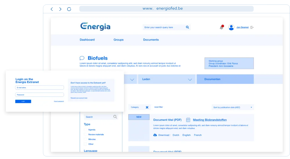 Na het verwerken van de feedback ontwikkelden we effectief het platform. Daarbij werd de content van de laatste vijf jaar van hun huidige extranet gemigreerd naar de nieuwe omgeving zodat deze data niet verloren ging. Bovendien moesten de leden op die manier niet opnieuw het volledige registratieproces doorlopen. Kortom: we gingen the extra(net) mile om de communicatie van Energia met haar leden te vergemakkelijken!