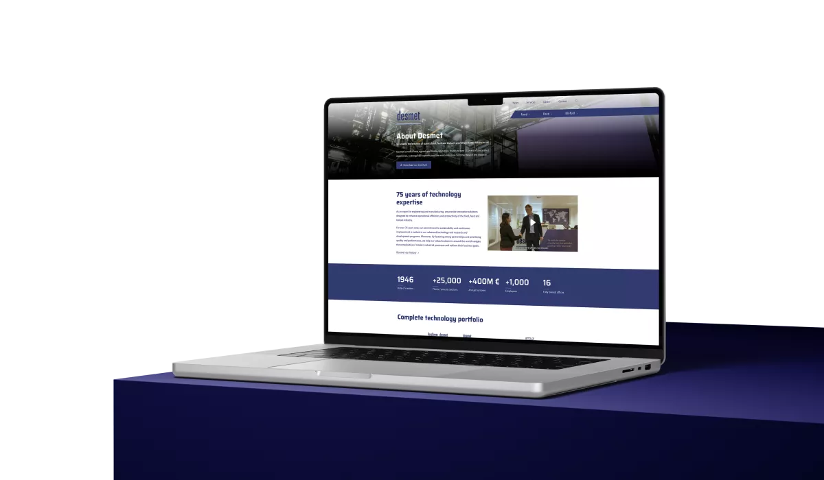 We startten de digitale transformatie van de corporate website met een strategische analyse om beter zicht te krijgen op de prestaties en behoeften. In een uitgebreide wireframing-fase structureerden we de content, zodat bezoekers intuïtief, snel en efficiënt hun weg vinden. Met resultaat. De nieuwe website schetst bezoekers vandaag direct een goed beeld van de omvang van het bedrijf en zet ook Stolz en Rosedowns, die deel uitmaken van de groep, in de kijker. Daarnaast is er ruimte voor nieuws en events, jobopportuniteiten en een uitgebreide sectie over de markten waarin Desmet actief is, inclusief de geavanceerde technologieën die het ontwikkelt voor diverse productieprocessen.